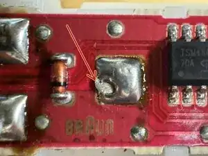 Уберите припой с трех (3) верхних выводов с платы.
