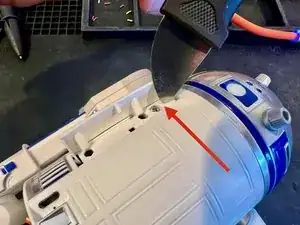 Используйте лопаточку или другой инструмент для поддевания, чтобы снять две вертикальные задние панели. Удалите винты, удерживающие заднюю часть дроида.