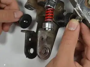 Снимите болт и подшипник, а также черные резиновые заглушки. Извлеките металлическую трубку между болтом.