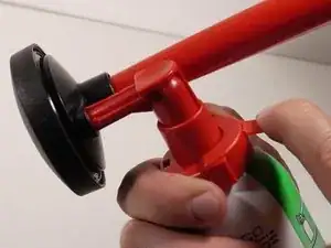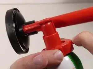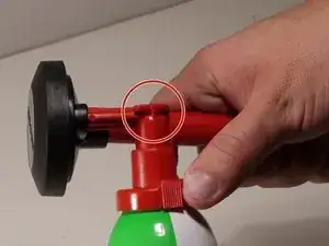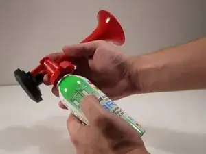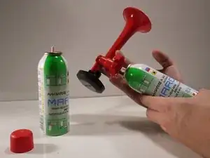 БЕРЕГИТЕСЬ. Держите пальцы подальше от рожка и красных отмеченных движущихся частей: когда рожок надет на баллон и вы нажмёте, он подаст сигнал!!