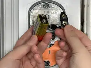 Замените старую батарею на новую 9V, прикрепив соединители к новой батарее, снова соблюдая осторожность с проводами соединения.