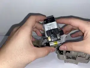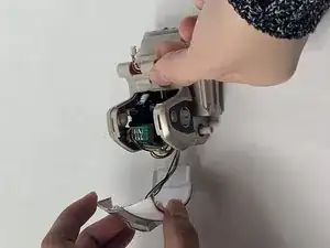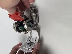 Удалите длинную белую пружину, прикреплённую к правому короткому рычагу, из центра корпуса, вытянув её руками и пальцами.