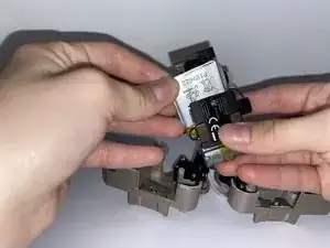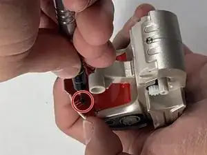 Удалите два винта 5,5 мм, расположенных глубоко справа (с вашей правой стороны, когда вы смотрите на перед робота) на золотом корпусе, используя отвертку JIS #0.