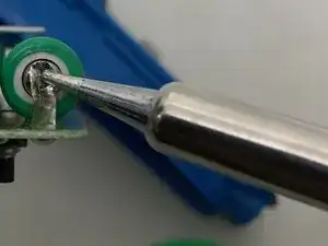 Нанесите флюс на контактную лапку, затем расплавьте припой на жале паяльника и поднесите жало к одной из четырёх контактных лапок. Повторите для остальных трёх лапок. Добавьте припоя, если батареи не фиксируются прочно в держателе.