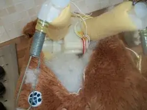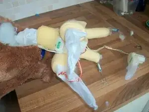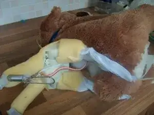 Установите передние лапы в чехол, затем задние лапы и хвост. Убедитесь, что все провода в лапах и хвосте покрыты наполнителем.