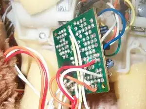 Аккуратно выпаяйте 3 провода старого блока питания. Протяните провода нового блока питания спереди игрушки. Припаяйте провода нового блока питания, убедитесь, что каждый провод подключён к правильному контакту на материнской плате.