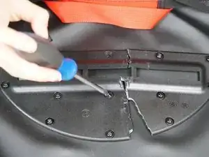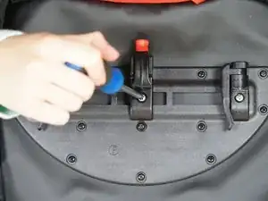 Открутите все 13 маленьких чёрных винтов. Для этого раскройте липучку в верхней части чехла для ноутбука. Гаечным ключом удерживайте гайку с обратной стороны сумки.