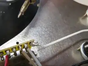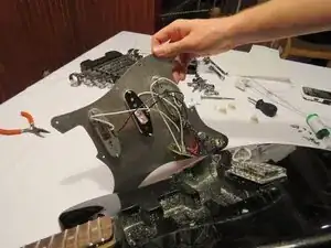 Аккуратно отведите пикгард от гитары. Обратите внимание на электронику. Есть провод, проходящий через корпус к разъёму выхода.