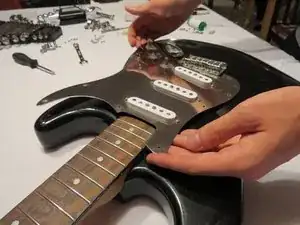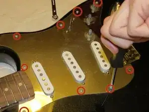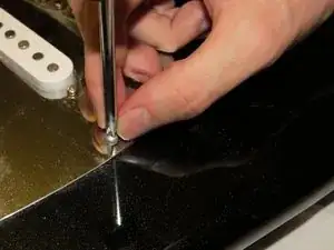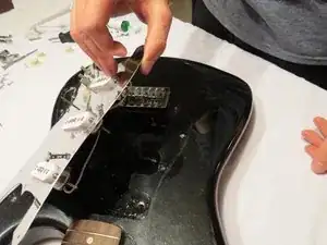 Осторожно приподнимите пикгард. После снятия винтов он должен быть свободным и легко сниматься с корпуса гитары.