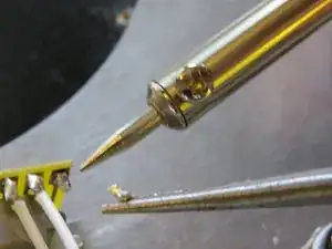 Покройте жало паяльника небольшим количеством припоя с канифолью.