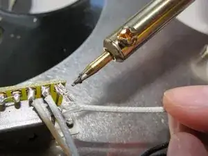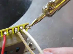 Расплавьте припой, остающийся на клемме переключателя, и быстро удалите лишний припой с клеммы. Обмотайте лужёный провод вокруг клеммы для надёжного механического соединения перед пайкой.
