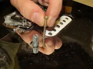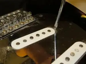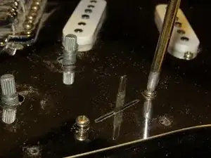 Хотя для снятия пикгарда не обязательно снимать ручки потенциометров, гораздо удобнее снять их, пока пикгард прикреплён к гитаре.