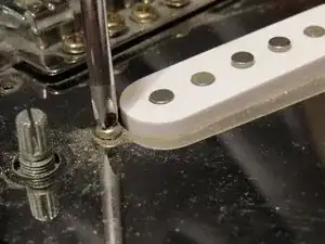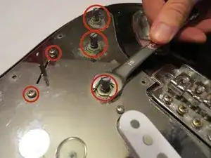 Положите пикгард обратно на корпус гитары. Возьмите ключ и ослабьте гайки вокруг стоек потенциометров.
