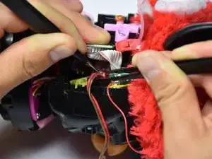 Разверните Furby на бок так, чтобы клюв был слева, и найдите край алюминиевой ленты.