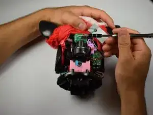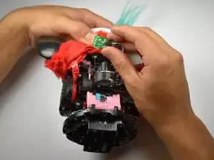 Для замены DC мотора необходимо снять заднюю панель и плату датчика света. Самая сложная часть этой замены — снять зажимы, удерживающие мех на задней панели.