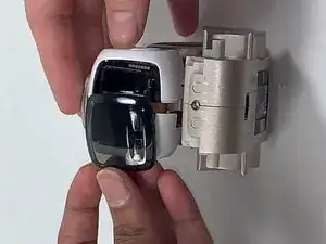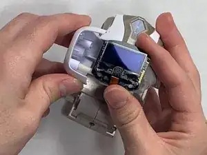 Отключите чёрный светодиодный экран камеры и белый с золотым динамик от небольшого белого разъёма в центре корпуса, потянув их руками и пальцами.