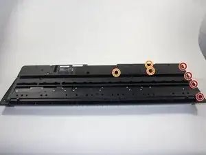 Найдите семь винтов размером 11 мм на задней панели клавиатуры, чтобы снять динамик с передней части клавиатуры.