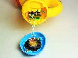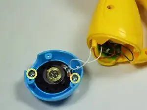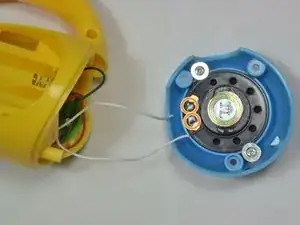 После удаления винтов аккуратно потяните корпус от желтого корпуса фонарика. Будьте осторожны, чтобы не отключить белые провода от динамика, если замена динамика не требуется.