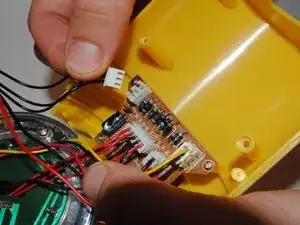 Проследите провода от динамо-машины до основной платы питания. Выньте белый разъём из гнезда на основной плате. Это разъединит электрическое соединение динамо-машины с остальной частью фонаря.