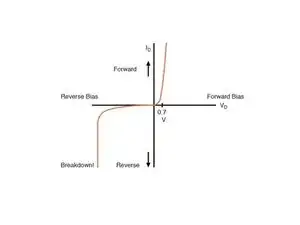 Теория диода; по оси X — напряжение, по оси Y — ток. Отсюда берутся диапазоны «пройден/не пройден» при тестировании диодов.