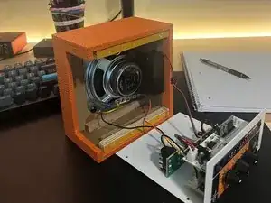 Начните с выкручивания четырёх деревянных винтов на задней панели. Осторожно откройте панель. Провода внутри достаточно длинные, чтобы заднюю панель можно было положить, не отсоединяя ничего.