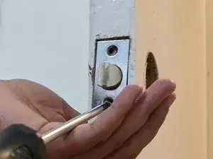 Удалите винты с существующей защелки, которая идет с проходной дверной ручкой.