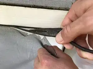 Используйте плоскогубцы с тонкими носиками, чтобы вытянуть резиновую нить экрана из складки каркаса бассейна.