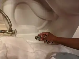 Удалите болты по обеим сторонам унитаза, затем аккуратно снимите его и положите на бок. Если места недостаточно — поместите унитаз на полотенце в другом месте. Действуйте аккуратно, чтобы не поцарапать поверхность.