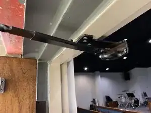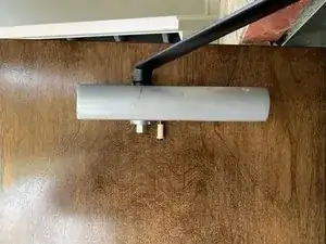 После установки корпуса гидравлического доводчика на верхней части двери, прикрепите конец рычага гидравлического доводчика к верхней части дверной рамы. Используйте отверстия от конца старого рычага гидравлического доводчика для правильного выравнивания рычага и закручивания винтов 25,4 мм без повреждения дверной рамы.