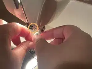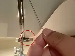 Убедитесь, что нитка проходит через иглу. Потяните нитку вниз под лапкой.