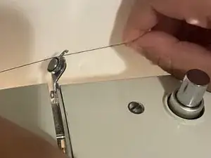 Тяните нитку вниз к себе в открытие на передней панели машины.