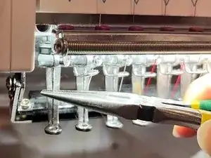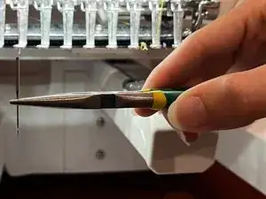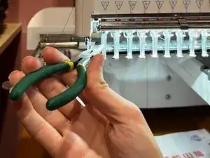 Затем с помощью круглогубцев вставьте новую иглу в держатель иглы и надежно зафиксируйте её.