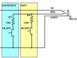 Обратите внимание, что педаль сустейна имеет четыре положения, и соответствующие четыре резистора подключены параллельно для кодирования положения педали. Аналогично, педали sostenuto и soft разделяют соединение кольца.