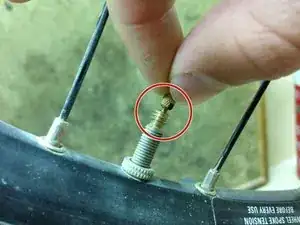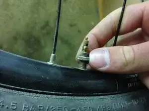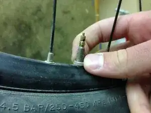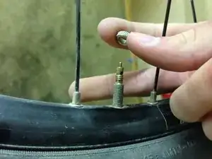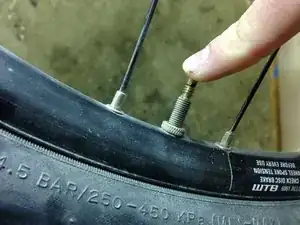 Слейте воздух из покрышки, нажав кончиком вентиля пальцем. Надавливайте до тех пор, пока не услышите выход воздуха из камеры.