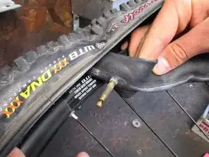 Установите покрышку обратно на обод, сначала вставив вентиль в его посадочное гнездо.