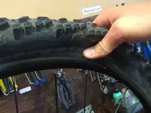 Используйте большой палец, чтобы прижать борт покрышки, пока вся её окружность не сядет внутри обода.