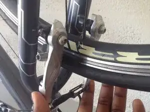 Сожмите обе стороны тормозного рычага одной рукой и поднимите металлический тормозной тросик от тормозного суппорта.