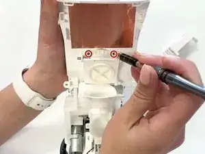 Используйте крестовую отвёртку №000, чтобы выкрутить два маленьких 3-мм чёрных винта с обеих сторон пластикового шарнира.
