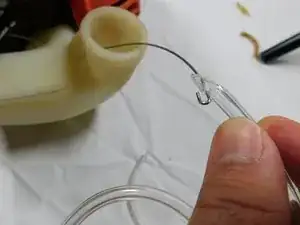 Чтобы было проще зафиксировать проволоку в шланге, сделайте отверстие, достаточное для прохода проволоки в шланге.