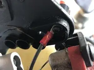 Этот провод прикручен к красной кнопке аварийного выключателя. Открутите его крестовой отвёрткой.