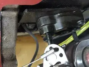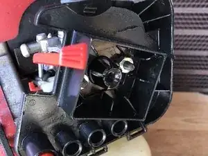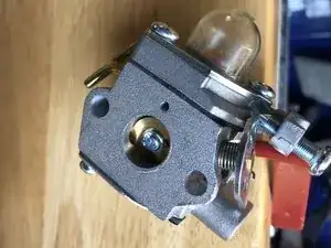 Вам придётся удерживать кнопку через корпус воздушного фильтра и вкрутить крепёж обратно в кнопку, держая весь узел относительно близко к триммеру.