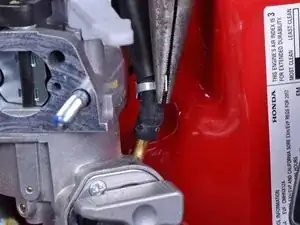 Используйте тонкогубцы, чтобы сжать и ослабить пружинный хомут на топливоподающем шланге.