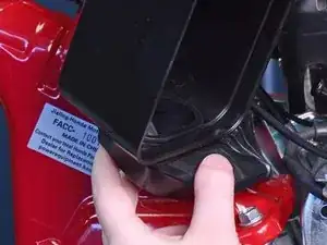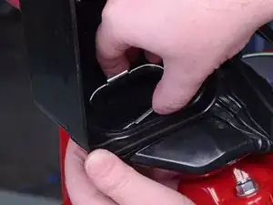 Сожмите металлическую защёлку на внутренней стороне крышки воздушного фильтра и снимите её.