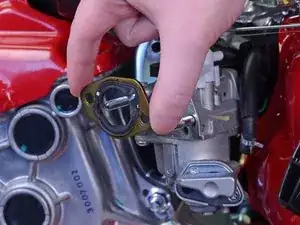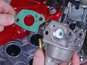 На выходе сзади карбюратора установлена тонкая прокладка. Осмотрите состояние прокладки и замените при необходимости.