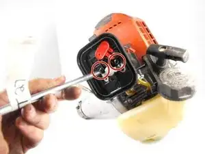 Используя отвертку T27, выкрутите два винта длиной 55 мм, которые крепят корпус воздушного фильтра и карбюратор к триммеру.
