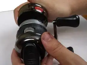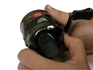 Установите переднюю крышку катушки обратно на катушку. Держите леску на несколько сантиметров перед катушкой и слегка натяните её. Намотайте леску на катушку, поворачивая ручку катушки.