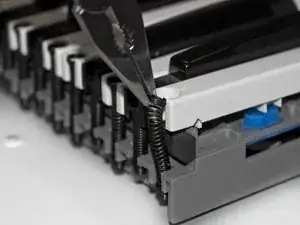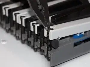 С помощью плоскогубцев схватите верхнюю часть пружинной спирали, которая удерживает клавишу, и аккуратно поднимите пружину от клавиши.