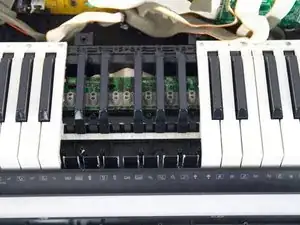 Если повреждены чёрные клавиши, снимите два набора по семь белых клавиш. Это откроет набор чёрных клавиш, которые в два раза длиннее наборов белых клавиш.
