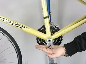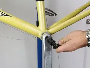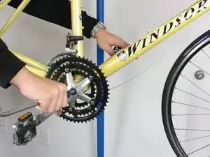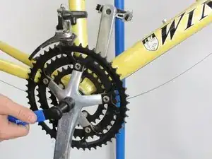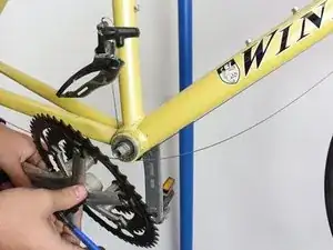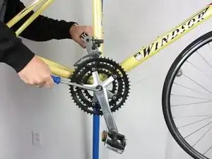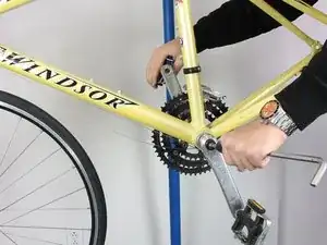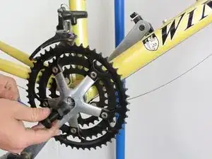 Чтобы снять шатун, вставьте подходящий шестигранный ключ в паз в центре шатуна, как показано. Поверните ключ против часовой стрелки, чтобы ослабить болт, крепящий шатун, пока он не начнёт свободно вращаться. Удерживайте противоположный шатун на месте, чтобы болт ослаблялся, а не проворачивался весь шатун.