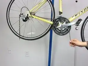 После разъединения звеньев потяните правую часть цепи вниз, как показано. Тяните, пока цепь полностью не сойдет с шестерен. Поместите цепь на бумажное полотенце или ткань, чтобы не допустить попадания смазки на поверхности.